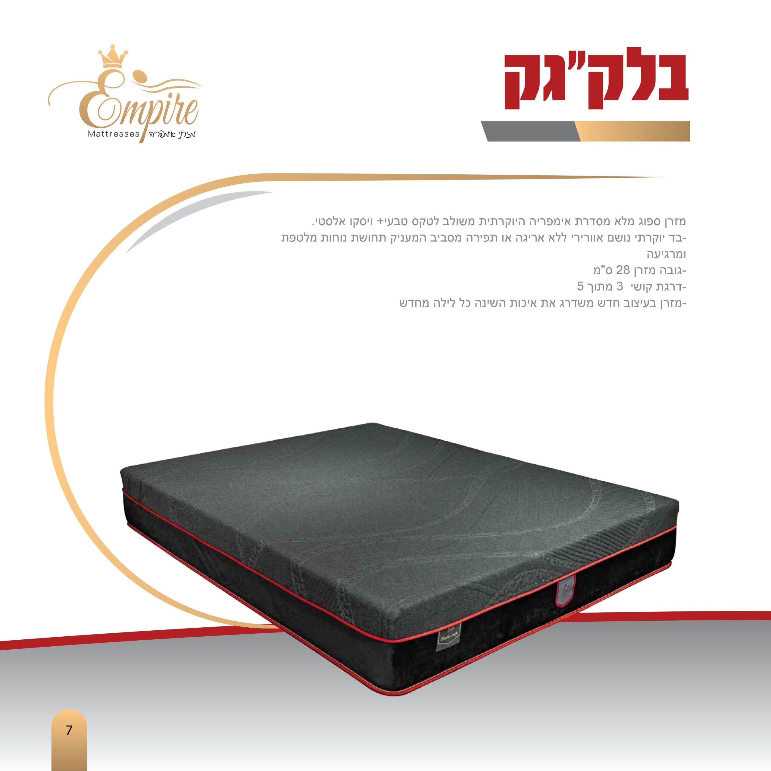 מזרן ללא קפיצים מסדרת אימפריה היוקרתית, בשילוב ויסקו אלסטי. המזרן בנוי משכבה יחודית של ספוג דחוס וגמיש במיוחד. בד יוקרתי באריגה עמוקה מפוארת ותפירה כפולה המסייעה לחיזוק וייצוב המזרן.